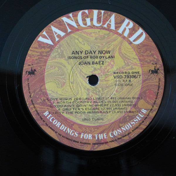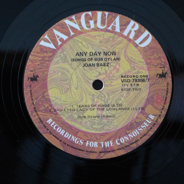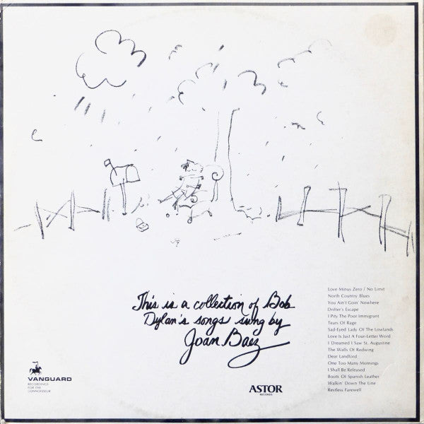 Mid 70's Australian made reissue Matt gatefold sleeve Bronze and yellow/green swirl labels with black text. White Vanguard scripts B&w sleeve, apart from spot yellow for the sun on front. Cut locally, three sides identify a total of three cutting engineers On record one, side one there is a scratched out digit between the 9 & 3. Information about who pressed the record is no longer present - it just lists "Astor Records". This is a collection of Bob Dylan's songs sung by Joan Baez.Data provided by Discogs