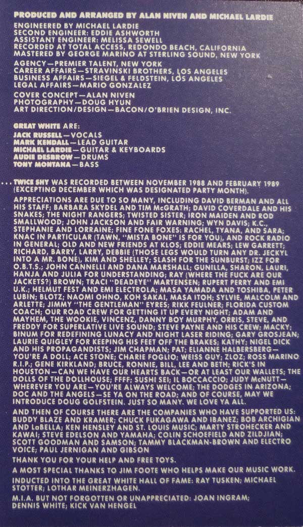 ...Twice Shy was recorded between November 1988 and February 1989 (excepting December which was designated party month).Data provided by Discogs