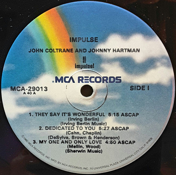 Seems to have the same cover as [r=9101080 ("MCA Impulse! 29013" gold stamp on upper right corner, non-gatefold, and no barcode), and same labels as [r=2791361 (MCA rainbow label with "MCA-29013" in larger text above "A 40 A/B" to the left of the spindle hole, and "SIDEI/II" to the right.Data provided by Discogs